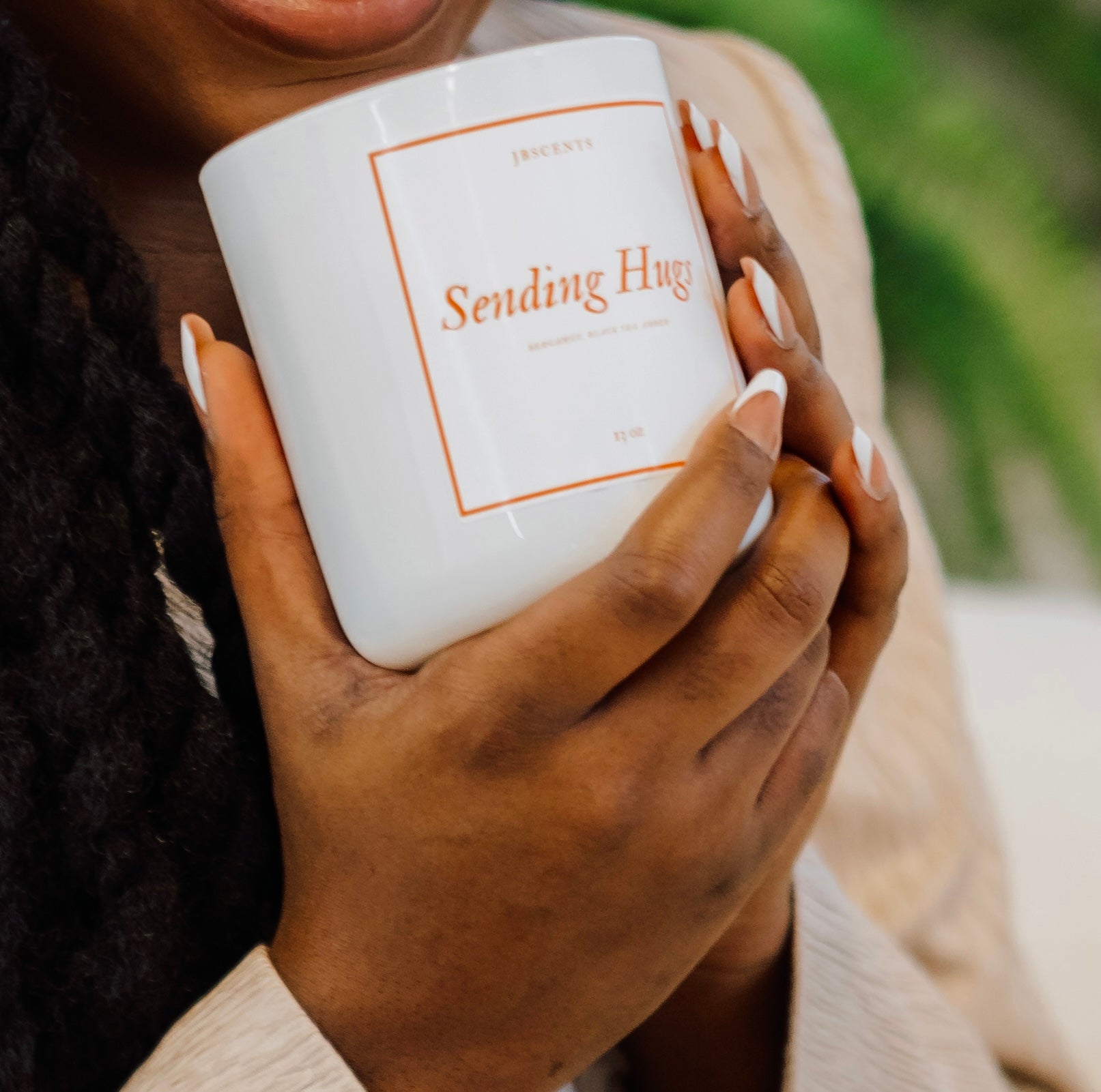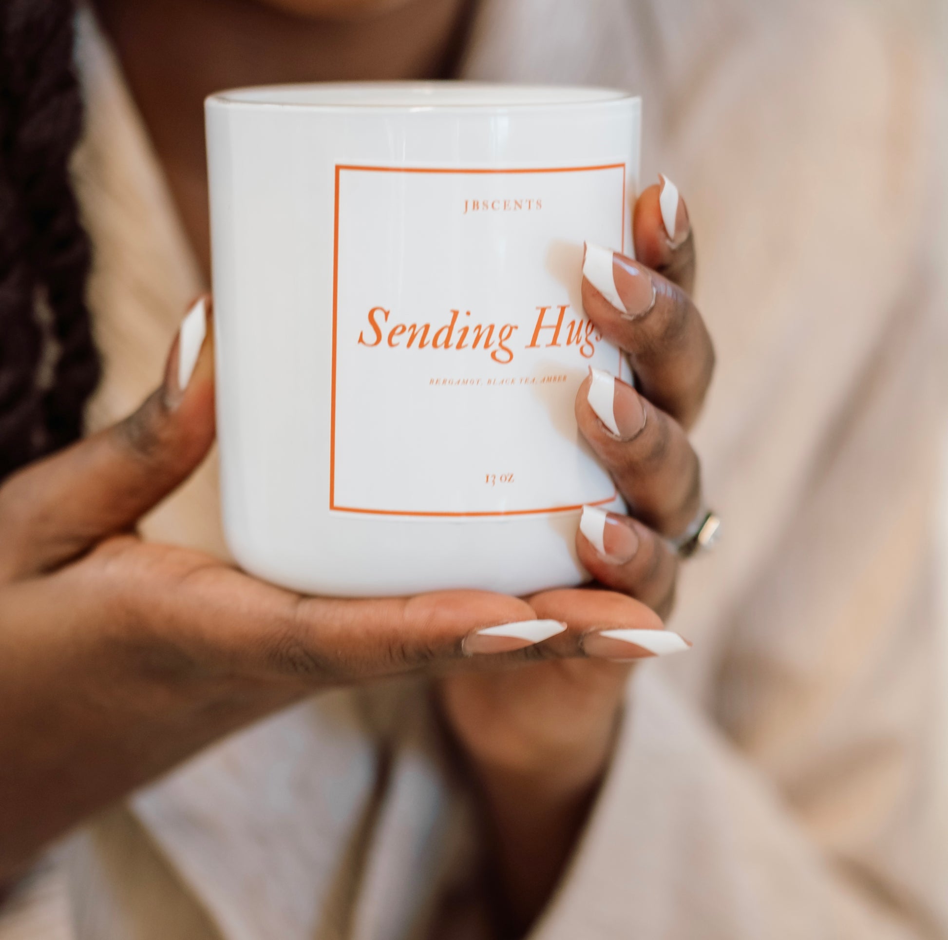 "Sending Hugs" candle carefully crafted with bergamot, black tea, amber to create a calming and reassuring scent that's like a warm hug for the soul